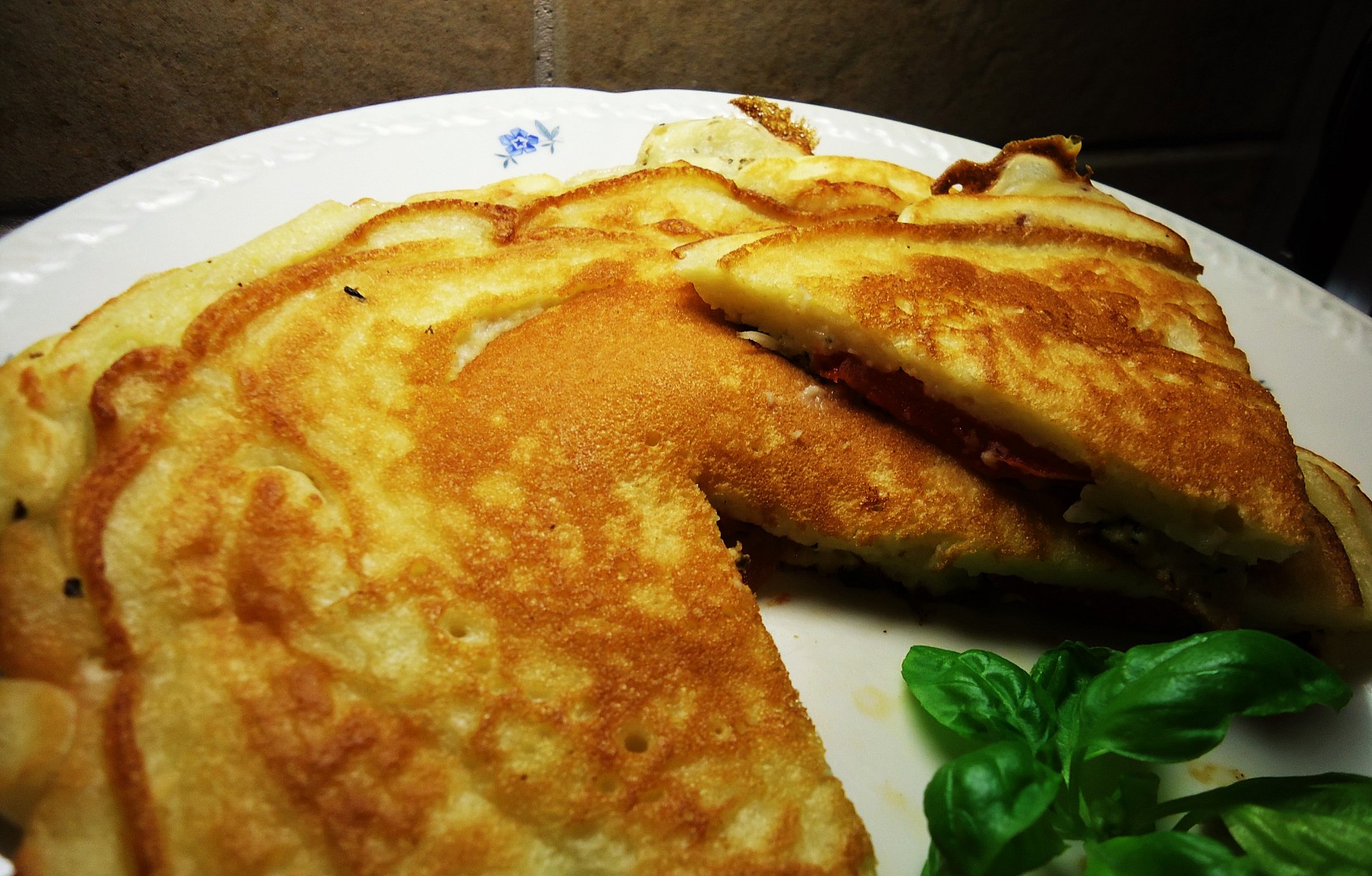 Na pánvi rozehřejte malé množství oleje, lžící rozprostřete na pánev polovinu těsta. Chvilku počkejte a až bude povrch z větší části sušší, odstavte z ohně a naskládejte rajčata, česnek a posypte bazalkou. Zalijte druhou polovinou těsta, rozetřete na náplň, přistavte znovu na zdroj tepla a přiklopte pokličkou. Nechte prohřát vrchní část těsta, přitom opečte z jedné strany, poté opatrně obraťte a dopečte dozlatova i druhou stranu.