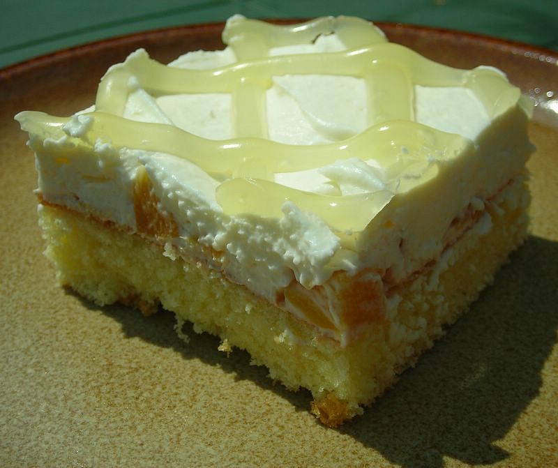 Je to velice osvěžující moučník. Místo broskvové „úpravy“ ho můžeme udělat třeba i v meruňkové….
