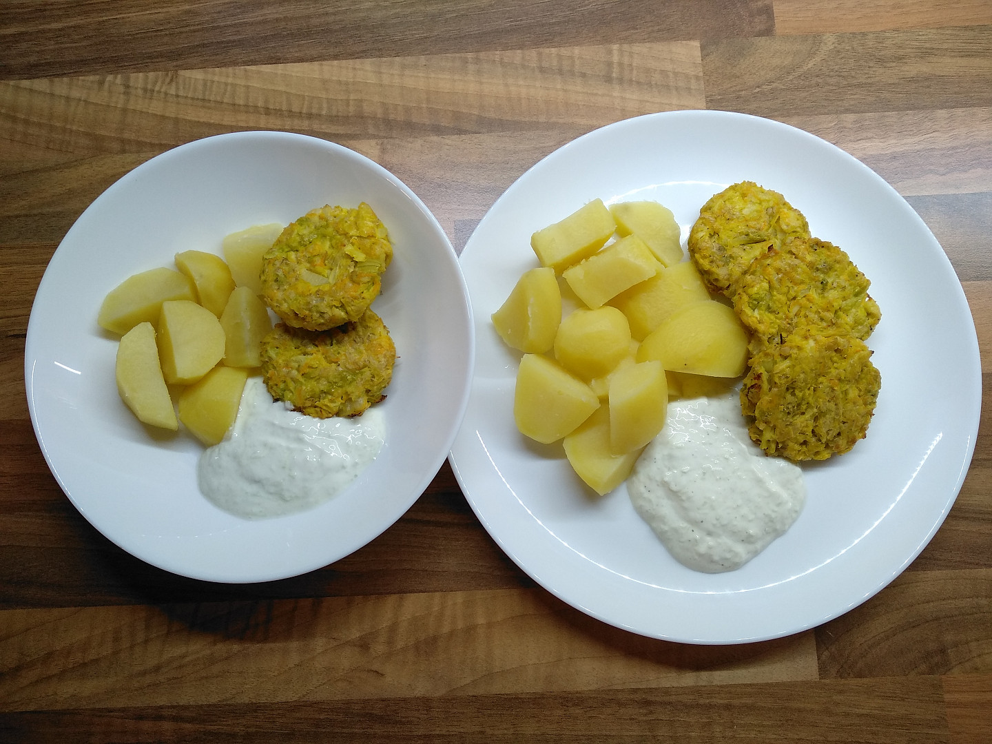 Podáváme s vařenými bramborami a jogurtovým dipem- v bílém jogurtu (co nám zbyl po přípravě karbanátků) zamícháme oloupanou a jemně nastrouhanou okurku, pro dospělé dochutíme solí a pepřem a rozetřeným česnekem.