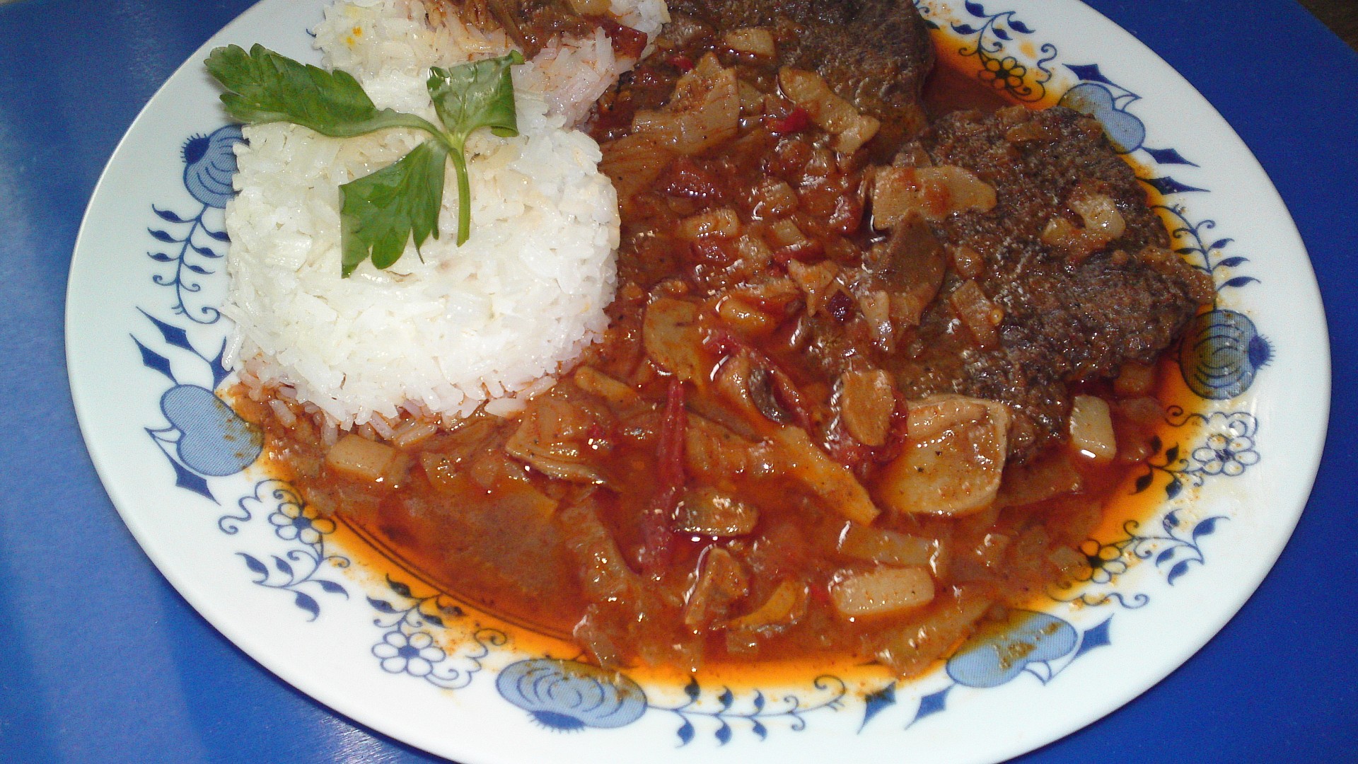 4. Podlejeme znovu horúcou vodou a pridáme huby. Dusíme pod pokrievkou do mäkka a dosolíme, dokoreníme. Podávame horúce s maslovými haluškami alebo s dusenou ryžou.