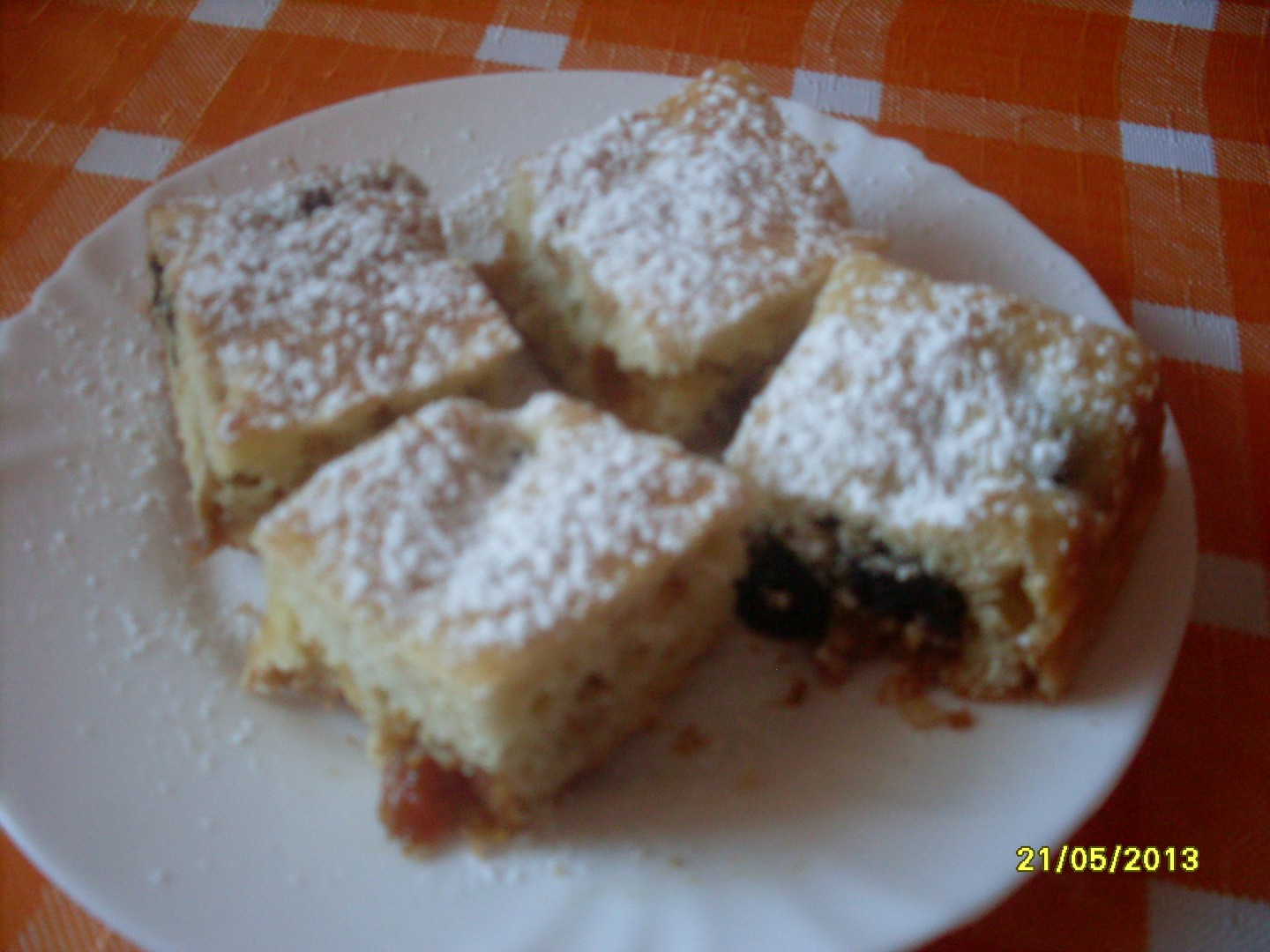 Sušené meruňky a jablka zalijeme vodou a necháme nabobtnat (švestky nebylo potřeba). Žloutky, cukr a olej vyšleháme do husté hmoty, přidáme postupně mouku s práškem a sodou, kefírem a vmícháme sníh, který jsme ušlehali z bílků.