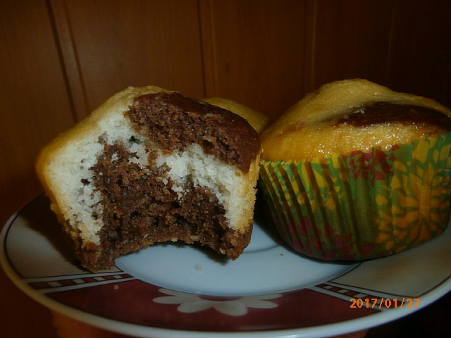 2. Těsto rozdělíme na dvě části. Jednu ponecháme bílou, druhou obarvíme kakaem. Oběma těsty plníme košíčky nebo formičky na cupcakes přibližně do 3/4. Pečeme ve vyhřáté troubě asi 30 minut, na 150 stupňů.