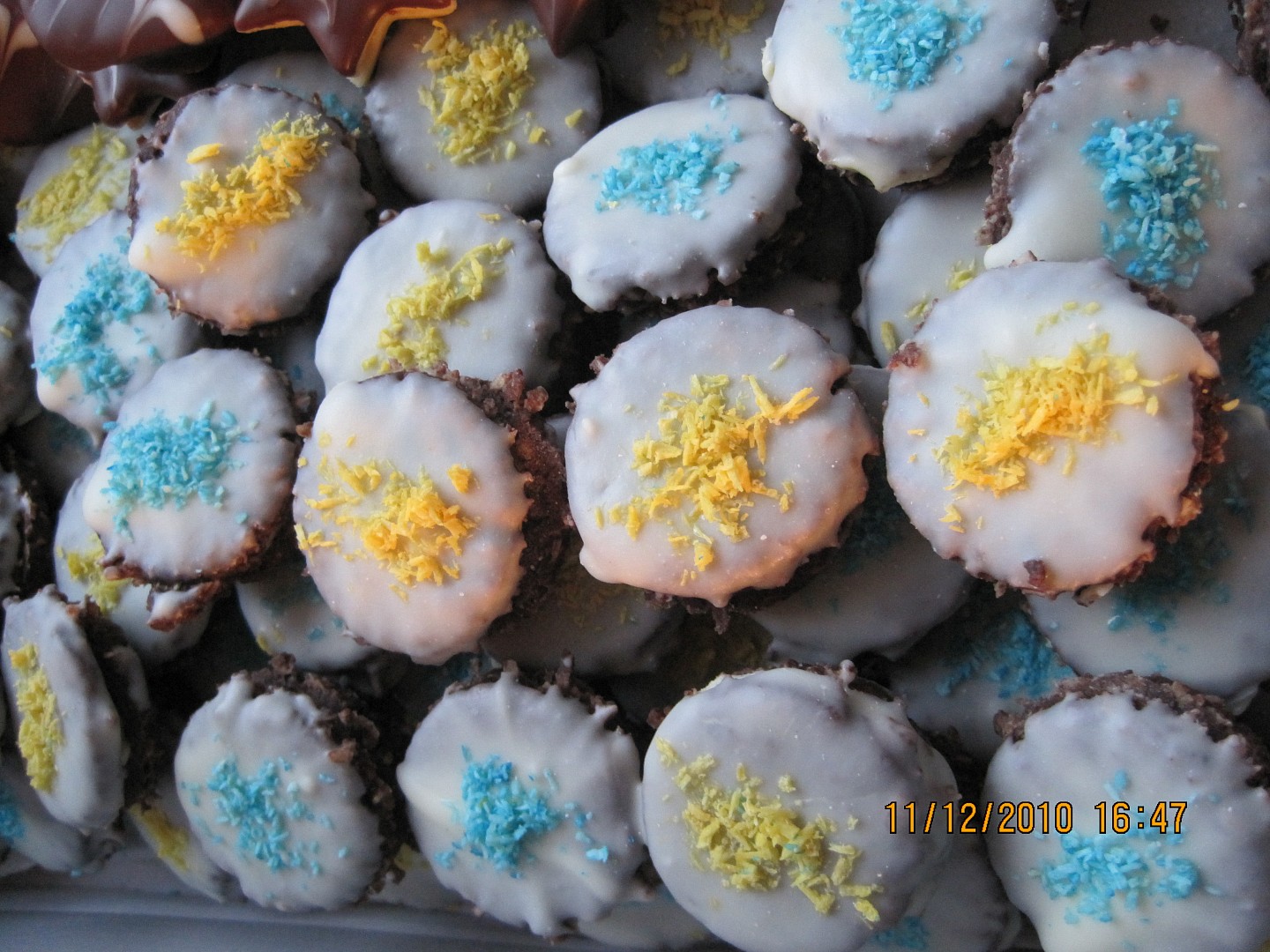 Upečená, vychladlá kolečka slepíme kokosovým krémem, polejeme bílou jogurtovou polevou a ozdobíme barevným kokosem.