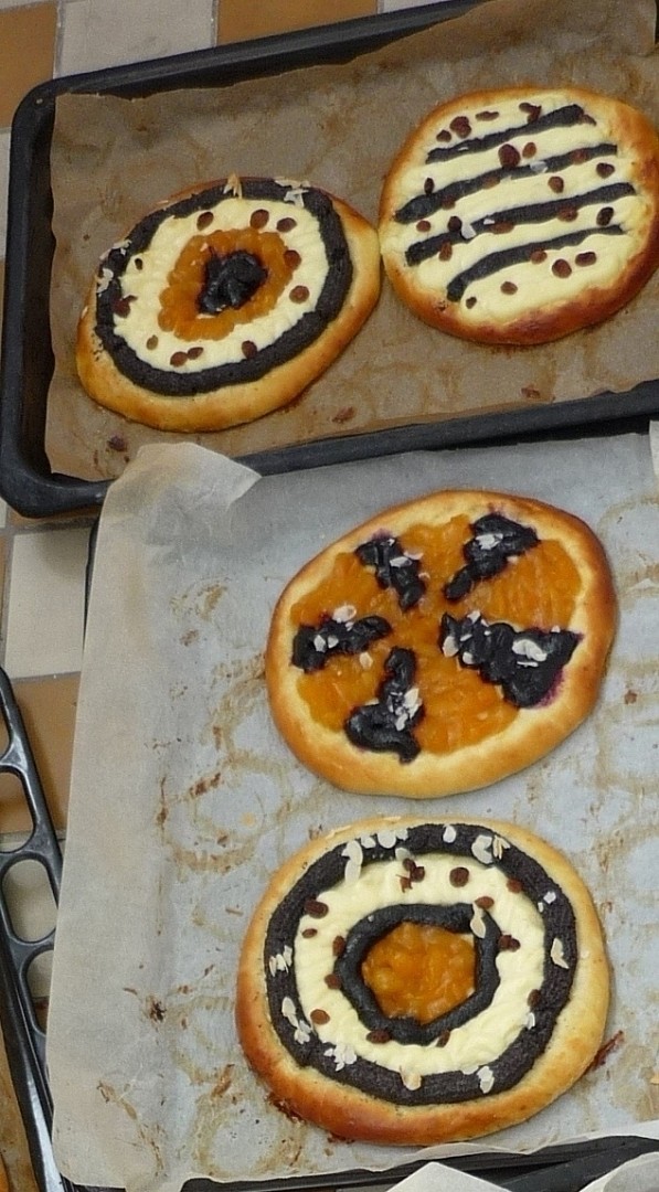 Okraje potřeme vajíčkem a koláče libovolně zdobíme náplněmi. Pečeme ve středně vyhřáté troubě dozlatova.