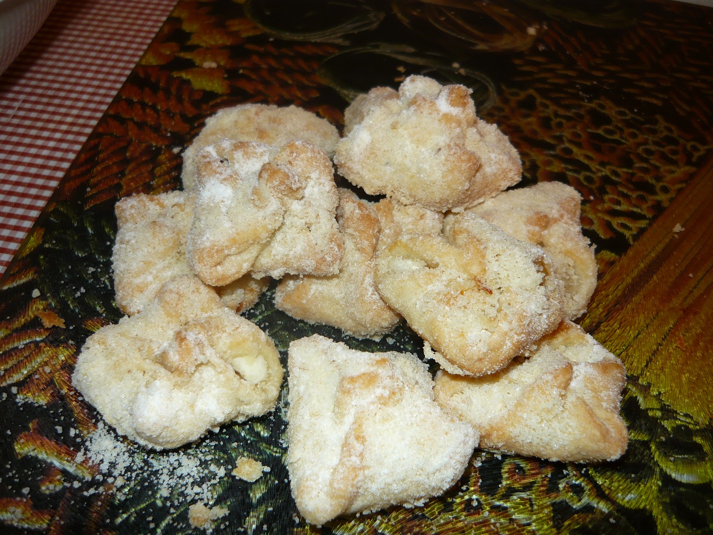 Vyválíme plát, radýlkem nakrájíme čtverečky, ty naplníme náplní, dle chuti uvážeme šátečky, posypeme žmolenkou a upečeme do růžova na 180°. Horké cukrujeme.