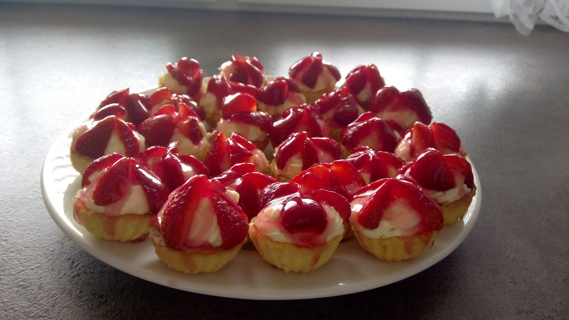 Pomocí zdobícího pytlíku, nebo pevého sáčku s ustřiženým rohem, plníme košíčky krémem, zdobíme jahodou a poléváme želatinou, kterou jsme připravili dle návodu.