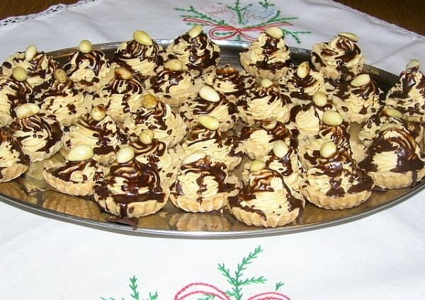 Z ingrediencí na košíčky vypracujeme těsto a necháme aspoň hodinu odležet v chladu. Pak natlačíme těsto do formiček formiček a pečeme cca na 180°C, přibližně 15 minut. Ještě vlažné vyklepneme.