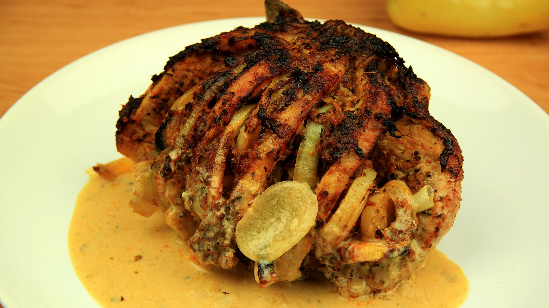 2. Do každé z kotlet dáme půl kolečka cibule a pomažeme celé marinádou z koření, česneku, nastrouhaného zázvoru, oleje a protlaku, i v mezerách.