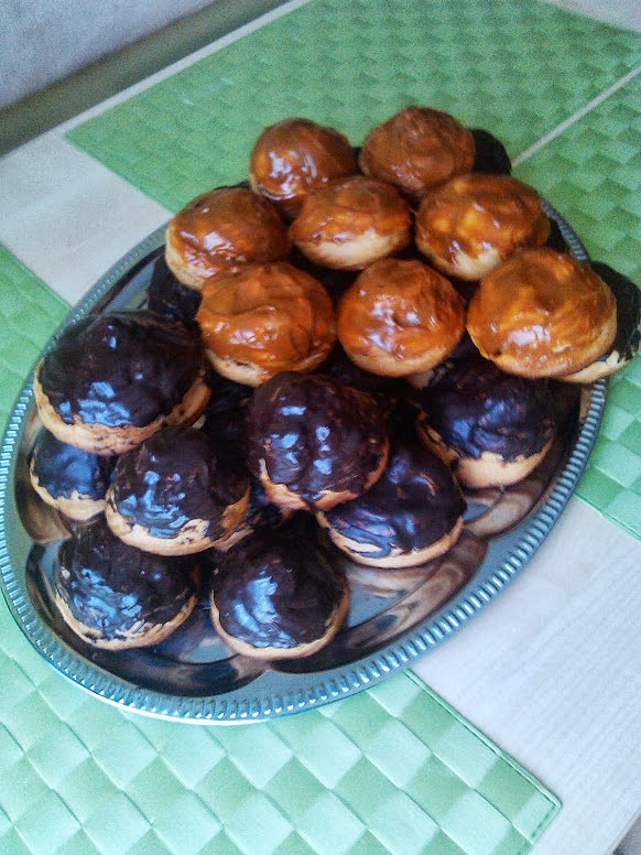 Voda + Hera se uvede do varu, rychle se přimíchá mouka a stále mícháme, dokud se na dně kastrolu neudělá bílý povlak. Pak ještě mícháme 2 až 2 a půl minuty. Předělá se do mísy a do vlažného se PO JEDNOM zamíchá 6 vajec. Nakonec pr.do peč. Pořádně mícháme, až se nechytá vařečky. Pečeme v roztopené troubě na 200 °C přímo na plechu (nepodmazáváme) nebo na peč.papíru dozlatova.