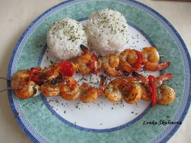 Mezitím nakrájíme cibule na menší kousky a rajčátka na půlměsíčky. Pak na špejle napícháme postupně cibuli, krevety, rajčátka a dáme je na rozpálený gril, tak 3-4 minuty na stranu. Podávala jsem s rýží.