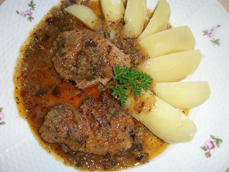 Dusíme, dokud maso nezměkne a průběžně podléváme. Podáváme s brambory nebo rýží.