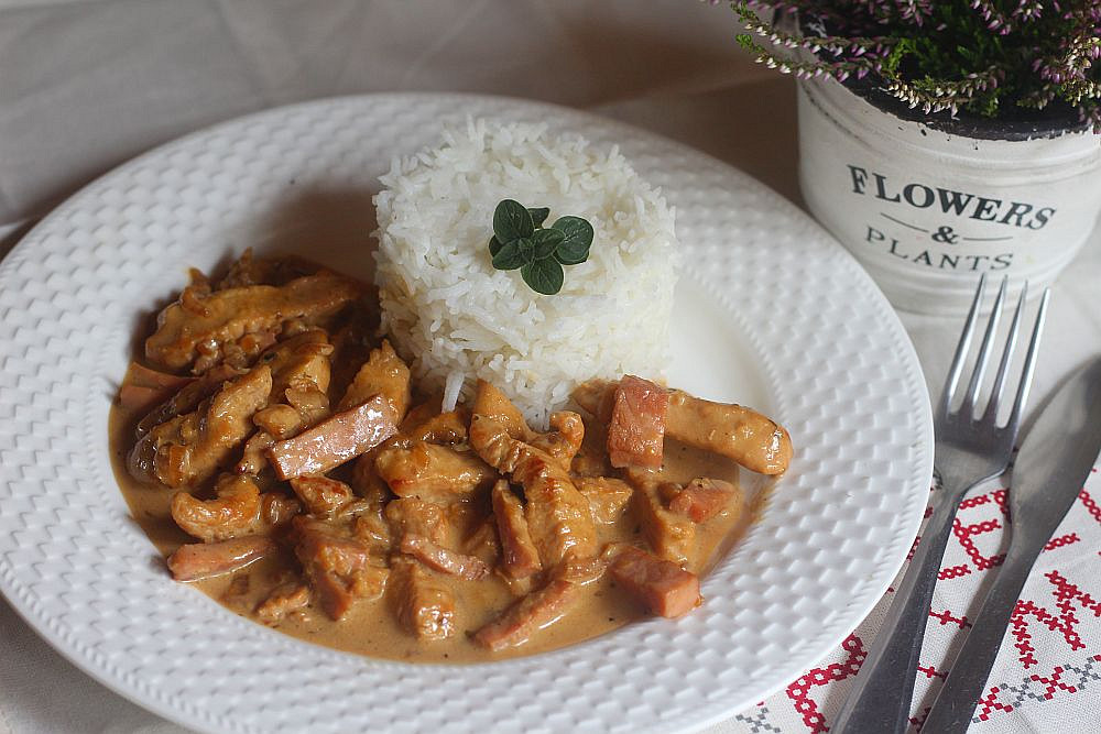 Šunku nakrájíme také na nudličky a přidáme k masu. Vmícháme utřený česnek, oregano, osolíme, opepříme a zalijeme smetanou. Když se smetana trochu zredukuje a zhoustne, máme hotovo.