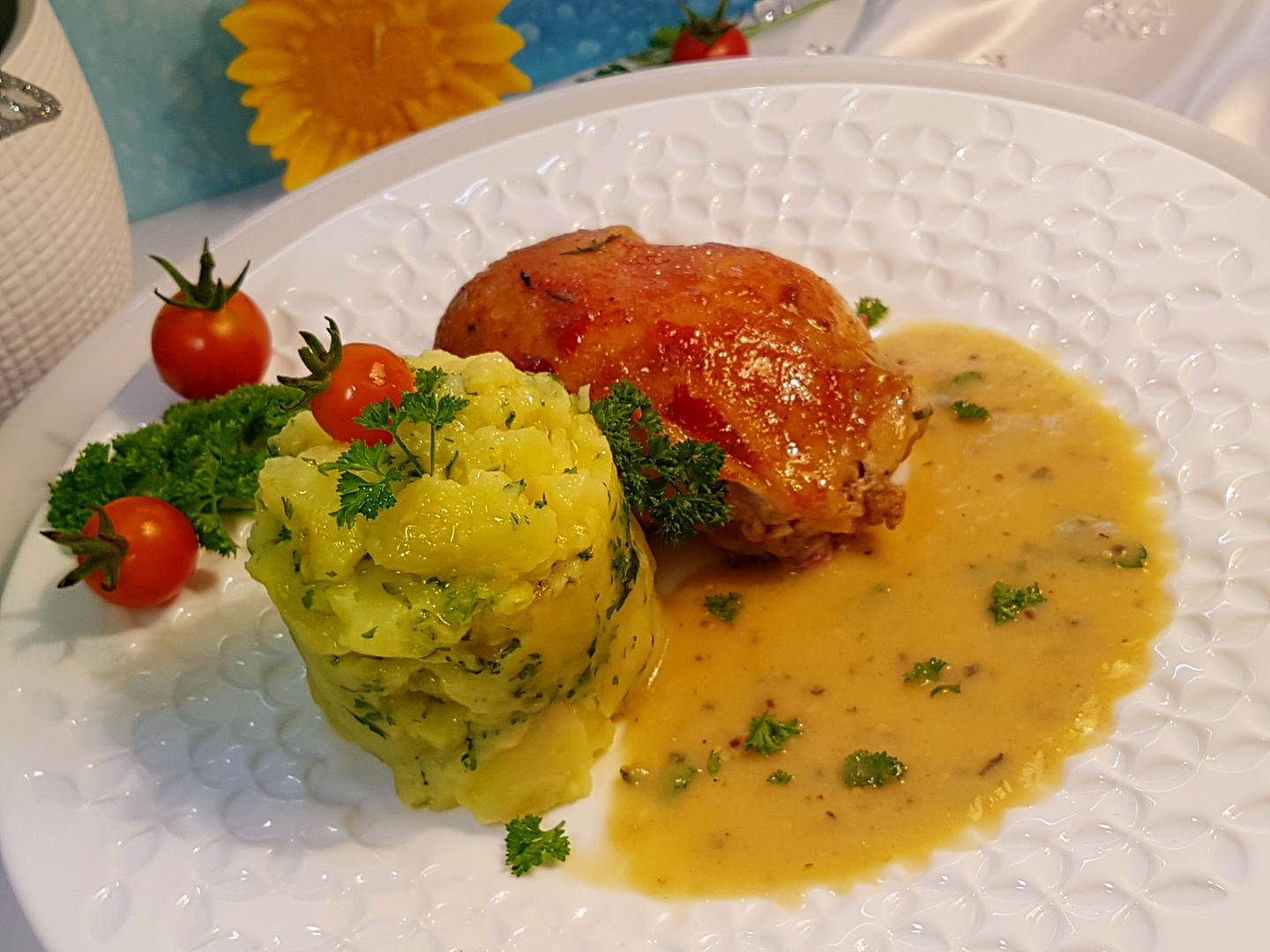 Servírujeme s omáčkou posypanou zbytkem petrželky a jako přílohu použijeme jakoukoliv úpravu brambor, či rýži.