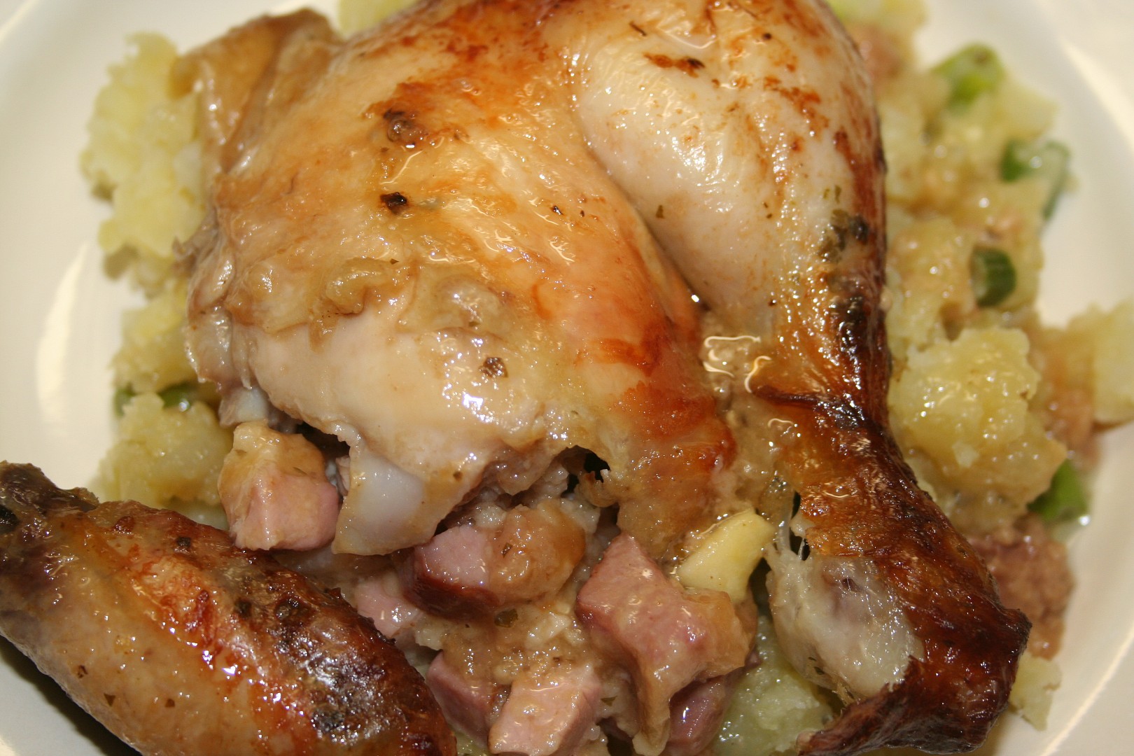 Omyté, osolené kuře vymažeme rozetřeným česnekem, naplníme nádivkou, zašijeme, pokmínujeme, pečeme na másle. Podléváme vodou.