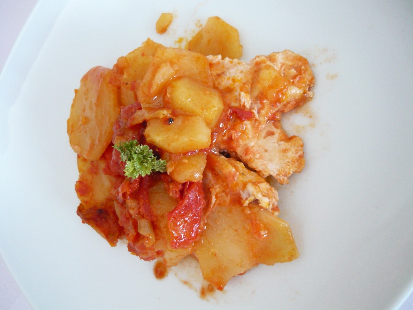 4. Na kuře poklademe na kolečka nakrájené syrové brambory, které osolíme a mužeme opepřit. Brambory převrstvíme připravenou podušenou zeleninovou směsi. Dle potřeby přidáme vodu.