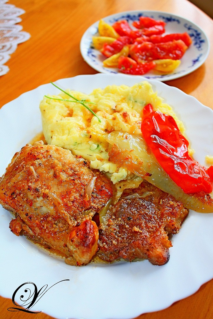 Kuřecí čtvrtky s vepřovou plecí a paprikami na Adžice