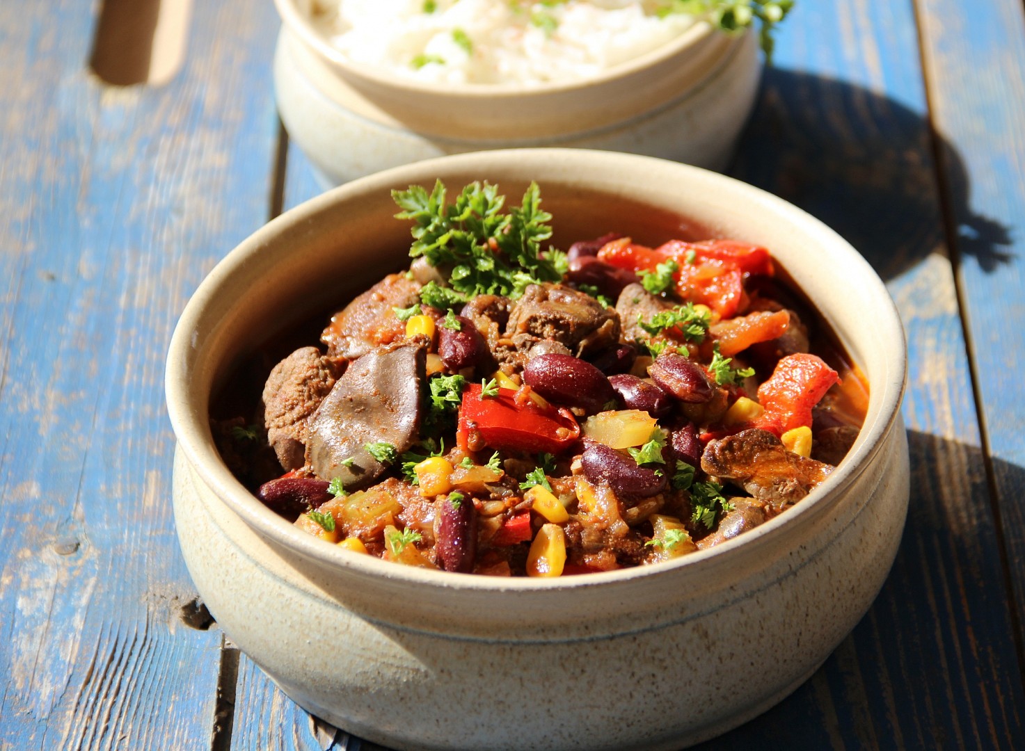 Nakonec přidáme prohřát fazole, kukuřici a posekaný česnek. Podle potřeby dochutíme. Podáváme posypané čerstvým koriandrem nebo petrželkou s rýží nebo tortillami.