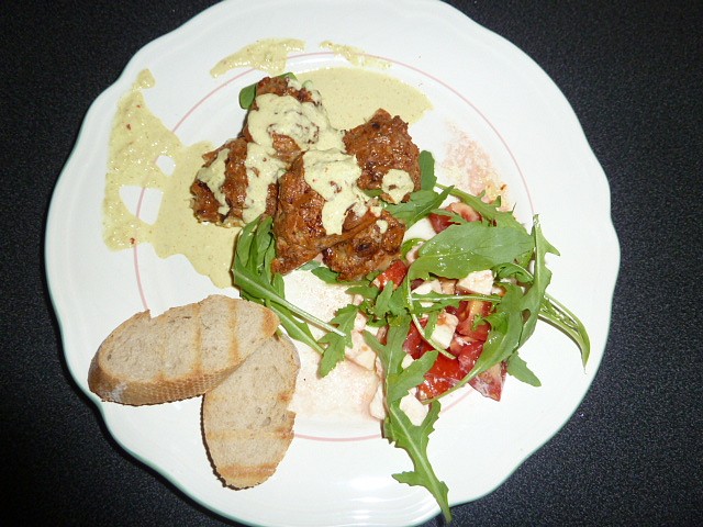 Kuřecí maso nakrájené na kousky namočíme do těstíčka z vajec, mouky, trochy gyros koření a opečeme na pánvi.