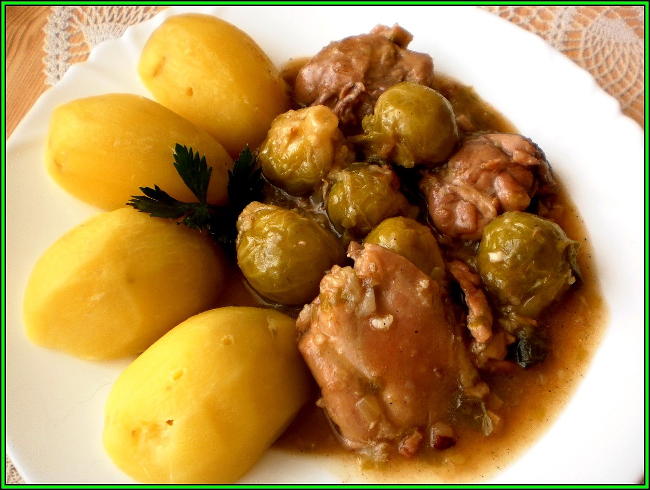 Kdo by chtěl mít toto jídlo úplně z jednoho hrnce, může zároveň s kapustou přidat na kostky nakrájené brambory, zalít šťávou a vše 15 minut povařit.