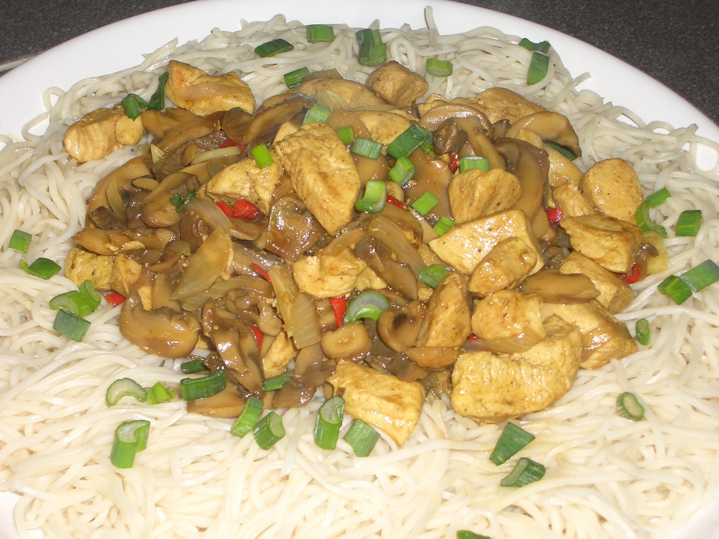 Naložené maso zprudka osmažíme na oleji, přidáme pórek, scezené oříšky a žampióny. Ještě chvíli za stálého míchání opékáme až je maso měkké. Nakonec podle chuti dosolíme, přidáme sójovou omáčku.