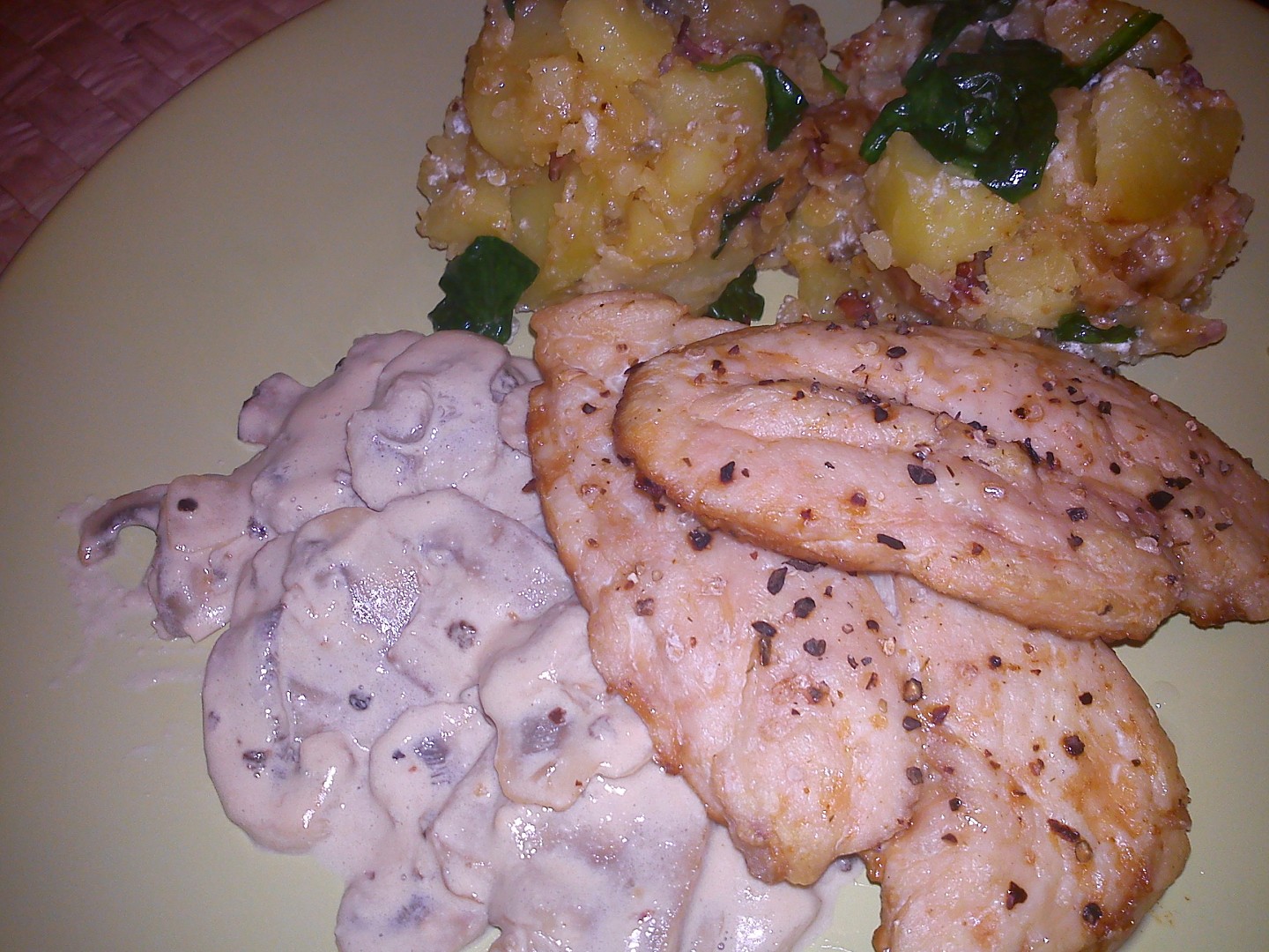 Kuřecí plátek s žampionovým přelivem a špenátovými bramborami