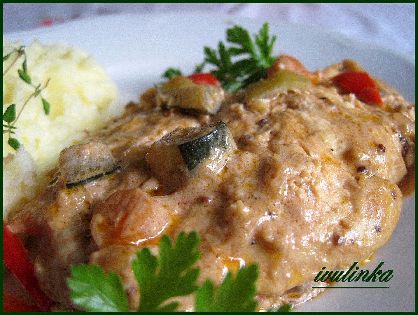 V misce rozmícháme zakysanou smetanu s troškou vody, vlijeme ji k zelenině a necháme provařit, můžeme malinko osolit, pak k zelenině vrátíme plátky masa, necháme prohřát.