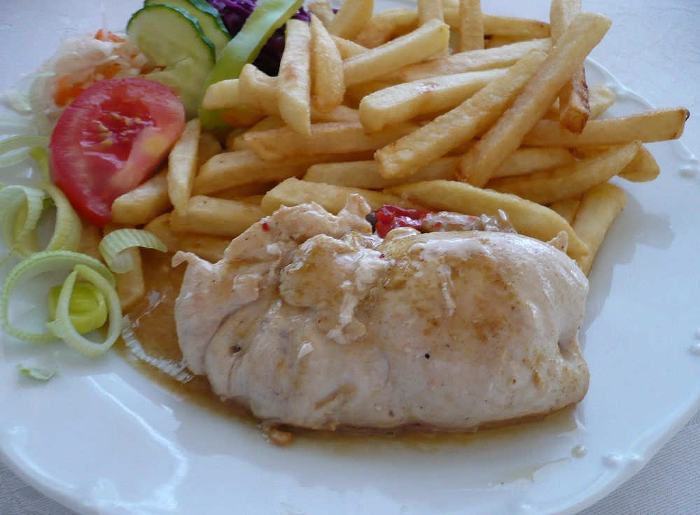 Kuřecí prsa rozřízneme a naklepeme. Osolíme, opepříme a dáme na ně plátek šunky a sýra.