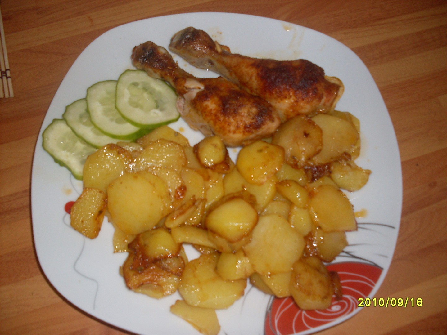 6. Na brambory dáme asi 2 lžičky vegety. Šťávou ze stehen pak můžeme polévat brambory. Můžeme přidat i zeleninu, tatarku nebo jiné přílohy.