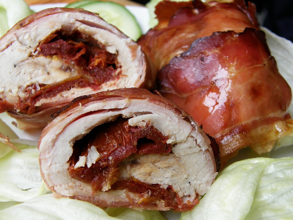 Řízky osolíme, / opatrně, šunka je dost slaná /, opepříme, poklademe sušenými rajčaty a kousky mozzarelly. Uděláme závitky, které obalíme šunkou.