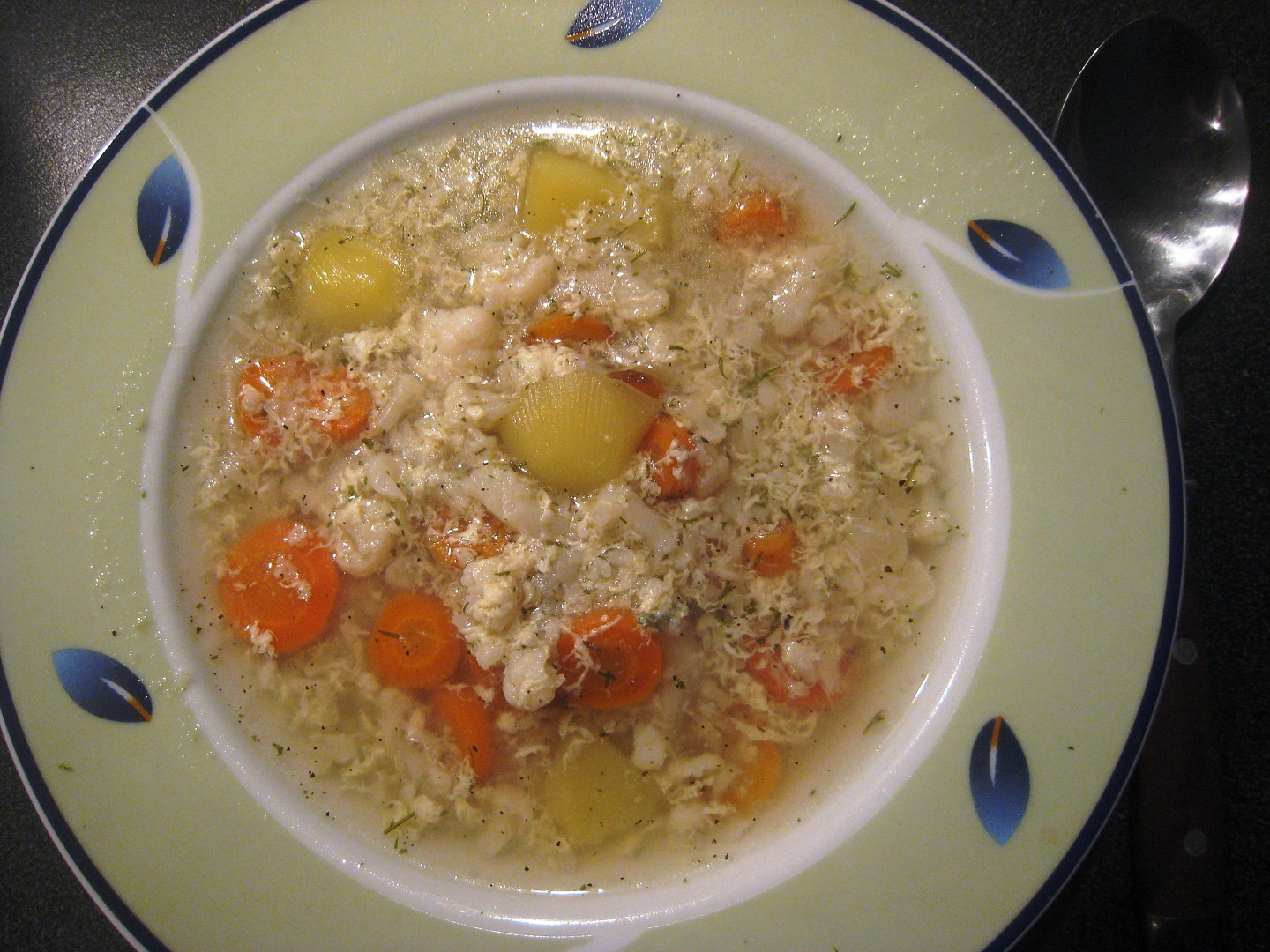 Vlejeme rozšlehaná vejce, přidáme nasekaný kopr a prolisovaný česnek. Povaříme, ochutnáme a dosolíme.
