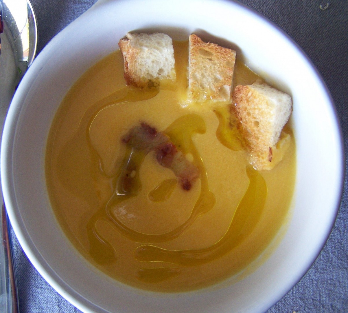 - pečivo na kostičky nakrájené opečené na pánvičce bez tuku