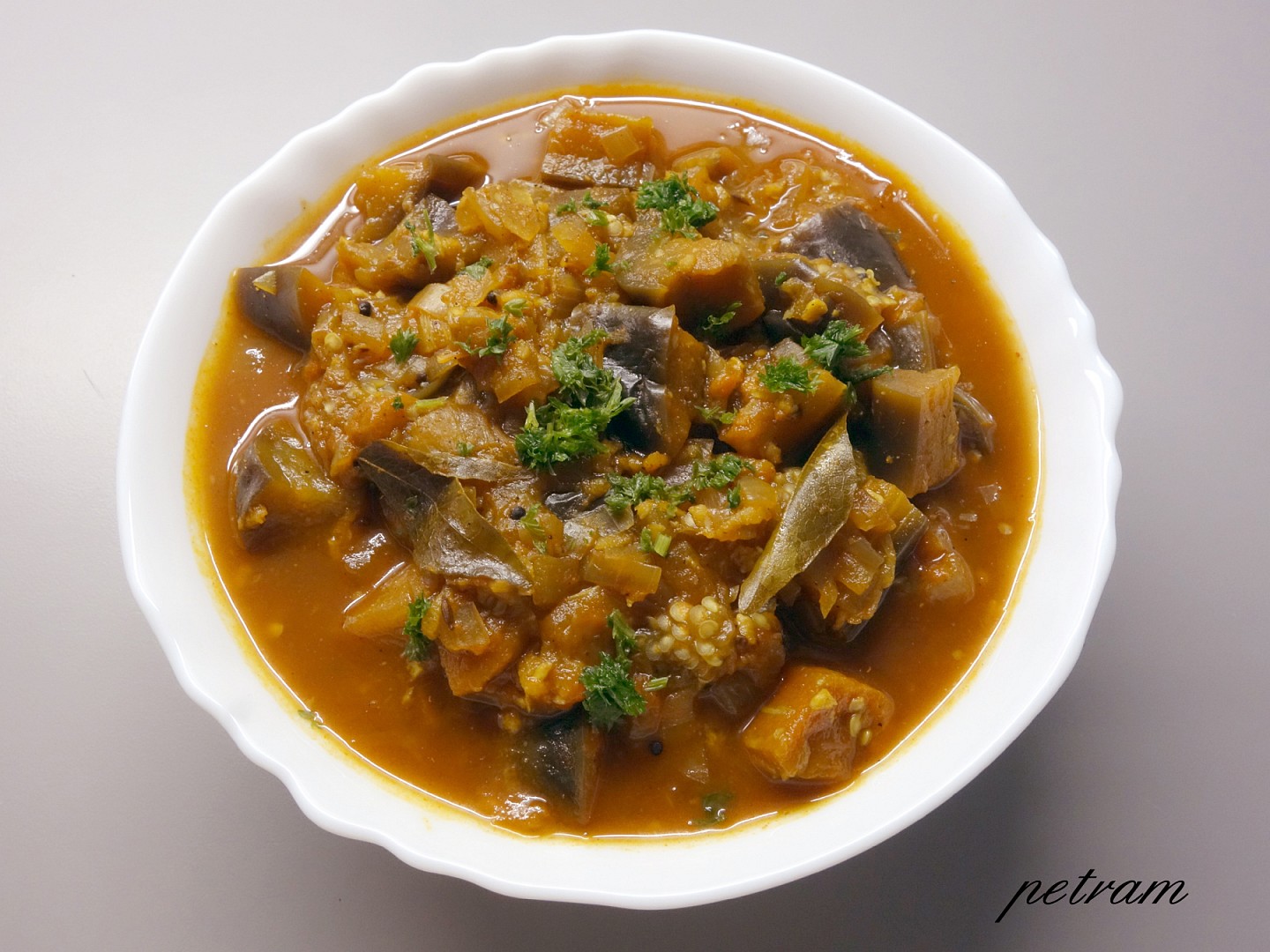 V hlubší pánvi rozehřejeme olej a necháme na něm asi 1-2 minuty rozvonět římský kmín a hořčičné semínko. Přidáme drobně nakrájenou cibuli a za stálého míchání ji necháme zezlátnout. Poté přidáme prolisovaný česnek a jemně nastrouhaný zázvor a ještě minutu restujeme. Přidáme zbývající koření (kurkumu, koriandr, garam masala, chilli koření, kari lístky) a minutu společně opékáme. Poté přidáme protlak a nakrájený lilek, osolíme, podlijeme menším hrnkem vody a za občasného zamíchání vaříme doměkka.