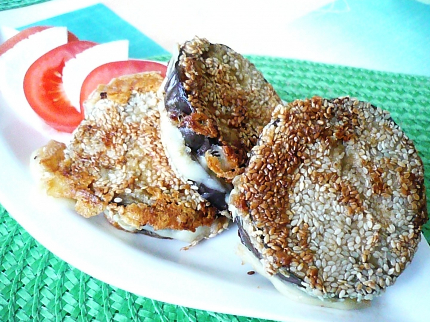 Baklažán narežeme na kolieska hrubé asi 1 cm. Polovicu koliesok osolíme, okoreníme a uložíme na ne asi 3 mm hrubý plátok tvrdého syra. Prikryjeme druhou polovicou koliesok.