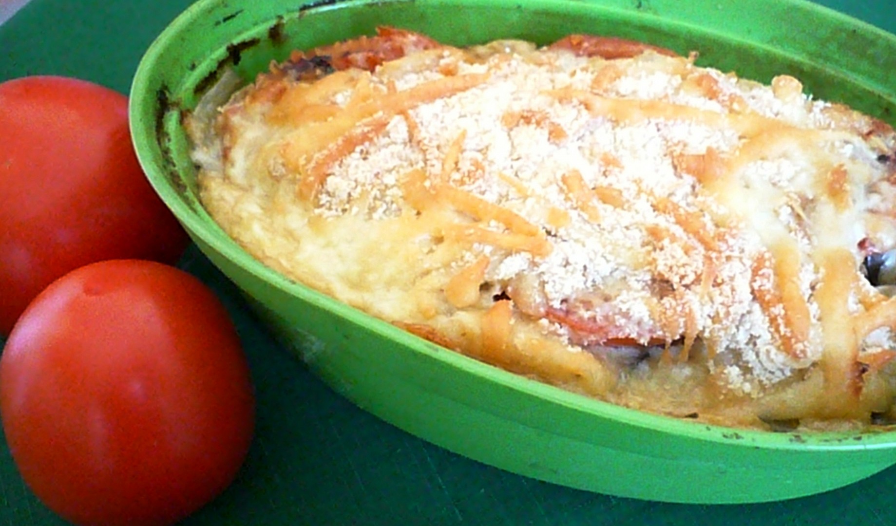 Odstavíme z ohňa a zalejeme studeným mliekom. Vmiešame vajcia a zmesou zalejeme zeleninu.