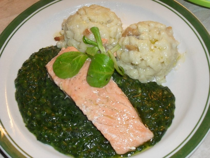 Na talíř dáme halušky, lososa a špenát, přelijeme výpekem z lososa a másla.
