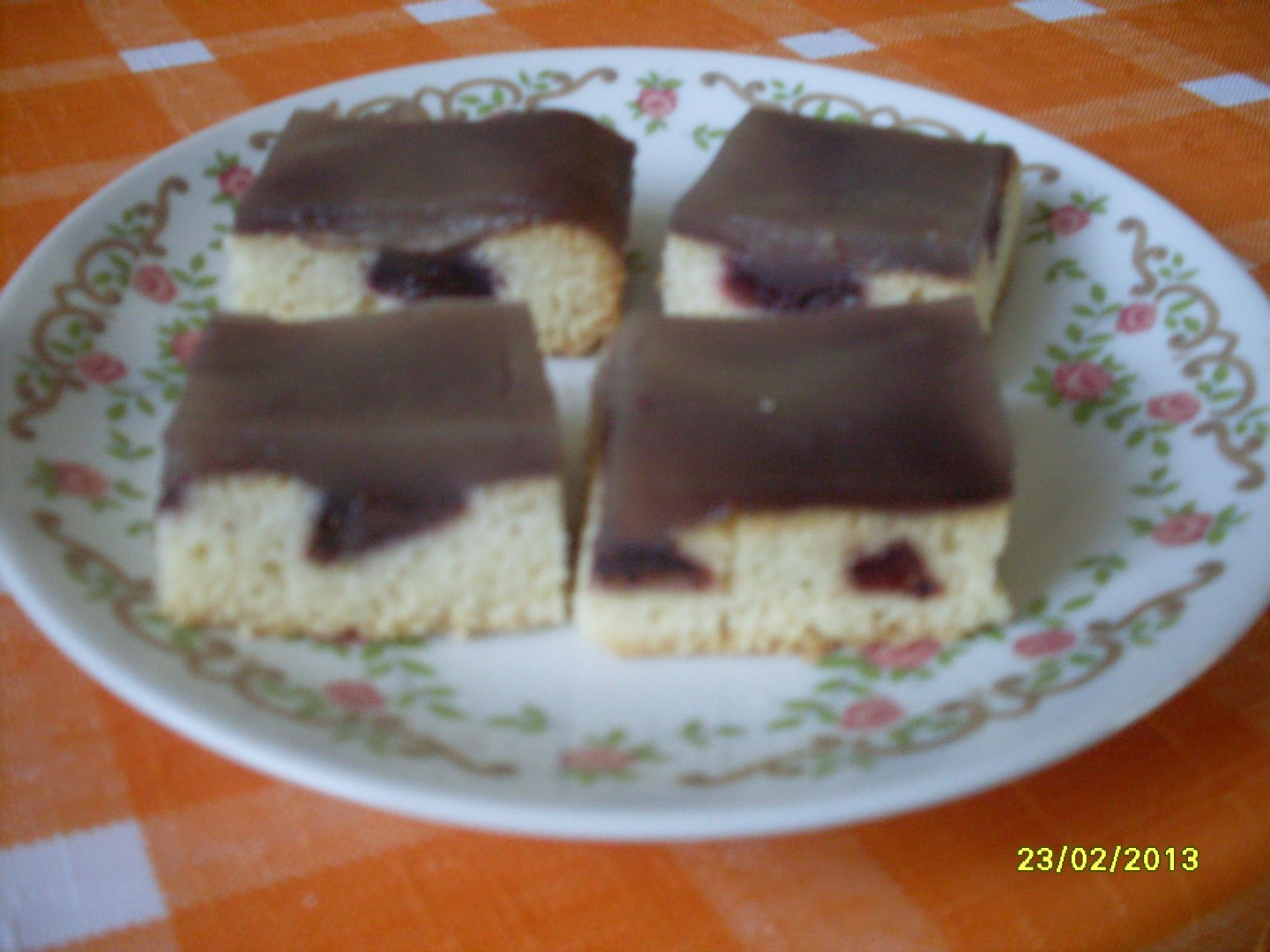 Po vychladnutí zalijeme pudinkem,který jsme udělali z prášku,vody a šťávy z kompotu.