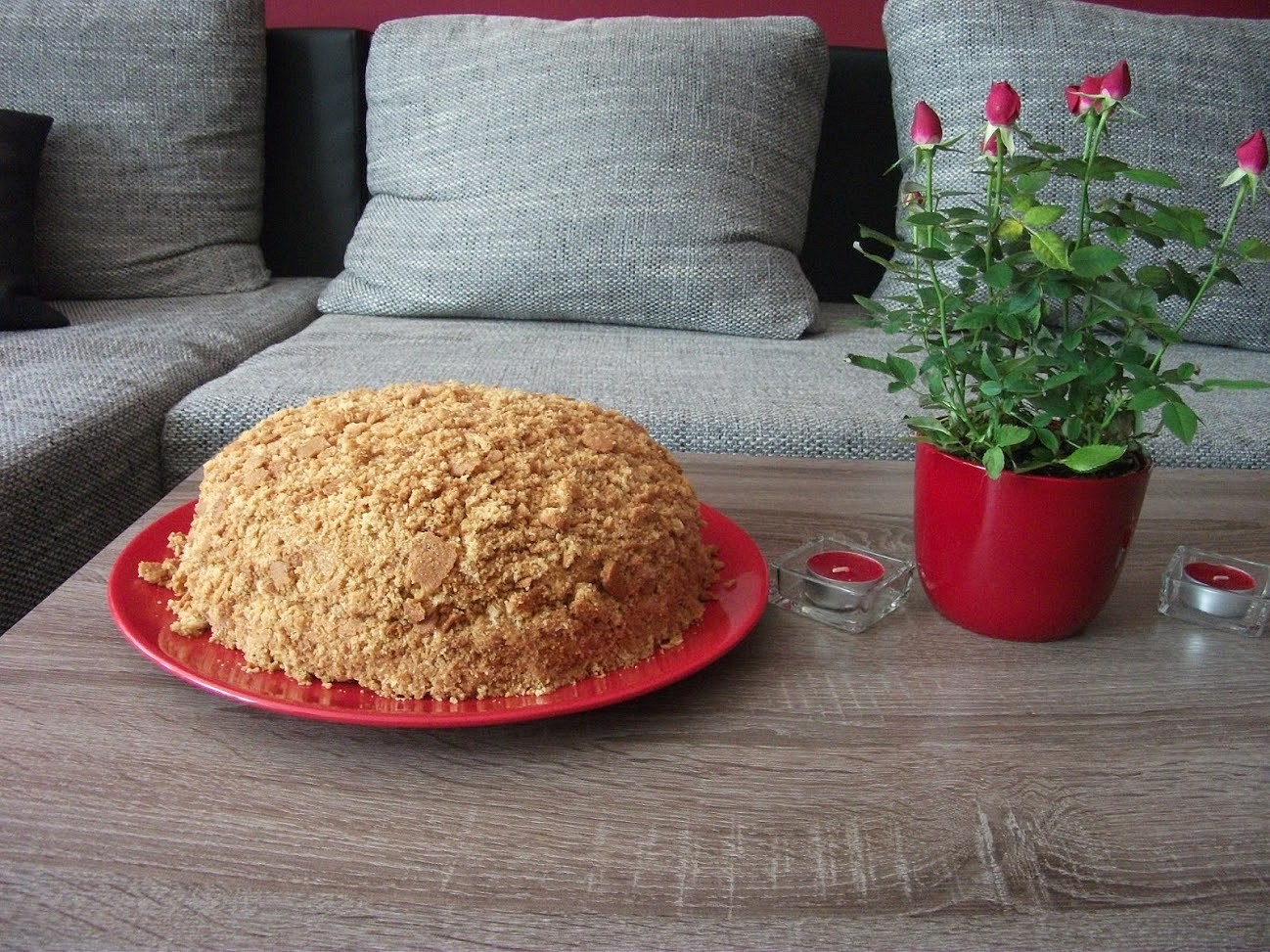Na první těsto naneseme zakysanou smetanu přiložíme další těsto a dáme korpus takto střídáme dále. Na uplný vrch příde salko, které rozetřeme i po obvodu a zasypeme strouhankou vytvořenou z přebytků těsta, boky poctivě uplácáme.