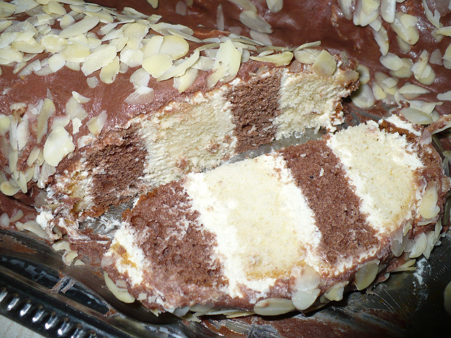 4. Vychlazené korpusy nakrájíme na 1 cm plátky (jako na chlebíčky). Slepujeme k sobě krémem střídavě světlé a tmavé plátky (vznikne dlouhý had). Ten pomažeme zbytkem krému. Dáme vychladit.