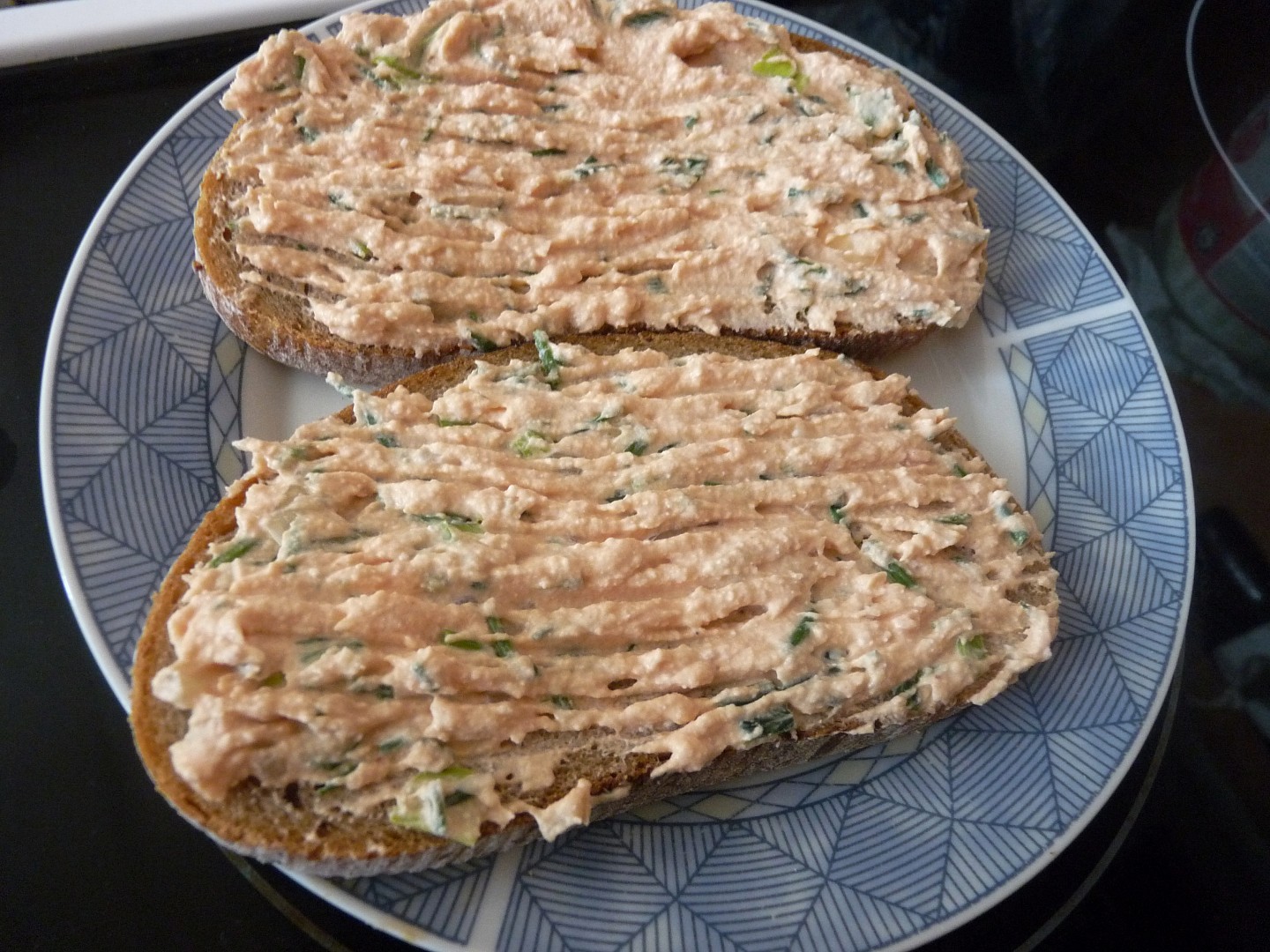 V misce rozmačkáme métský salám, smícháme s tvarohem – já použila vidličku, lze i mixovat do hladka. Opatrně přiléváme smetanu ale jen do námi chtěné konzistence a současně pečlivě mícháme.