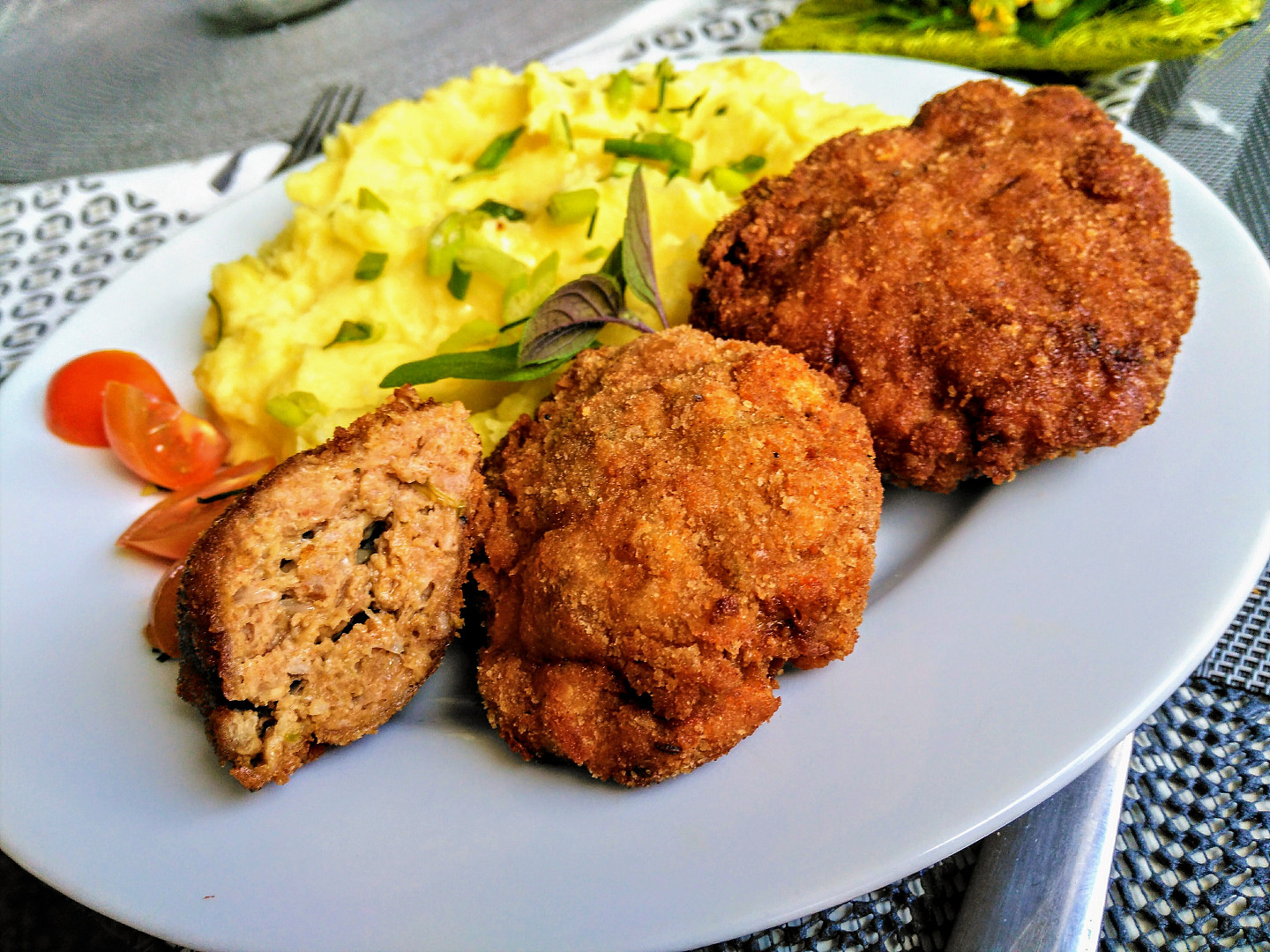 2. Zlehka vmícháme strouhaný čedar. Uděláme mokrou rukou placičky, které obalíme v těstíčku z vajec a hladké mouky. Nakonec obalíme ve strouhance s uzenou paprikou. Smažíme v rozehřáté troubě na plechu s pečícím papírem dozlatova. Podáváme s bramborovou kaší s dijonskou hořčicí.