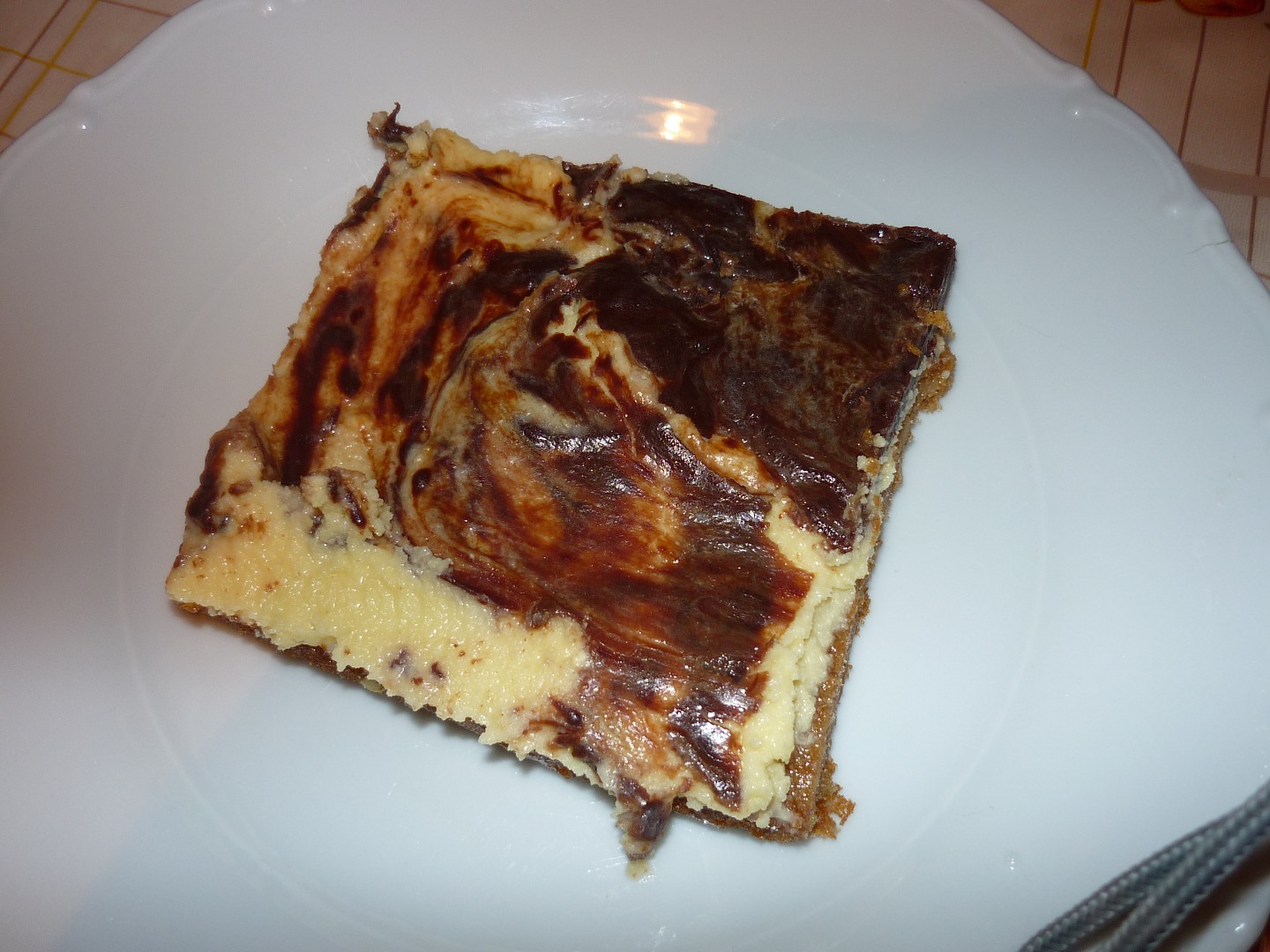 Máslo utřeme se žloutky, cukrem a kakaem, přidáme mouku smíchanou s práškem do pečiva, ořechy a sníh z bílků. Vymícháme těsto, rozetřeme na vymazaný a vysypaný plech a pečeme asi 20 minut při 180 stupních.