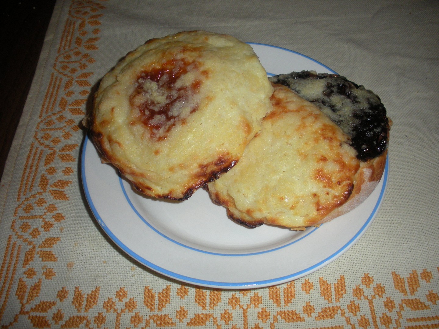 Rozvaľkáme asi na 1 cm a vykrojíme kolečká s priemerom 8 cm. Vyšlo mi ich 15ks. Spodom pohára zatlačíme stred, aby sa spravila jamka. Na každý koláč dáme kôpku tvarohu, kôpku jahodového džemu.
