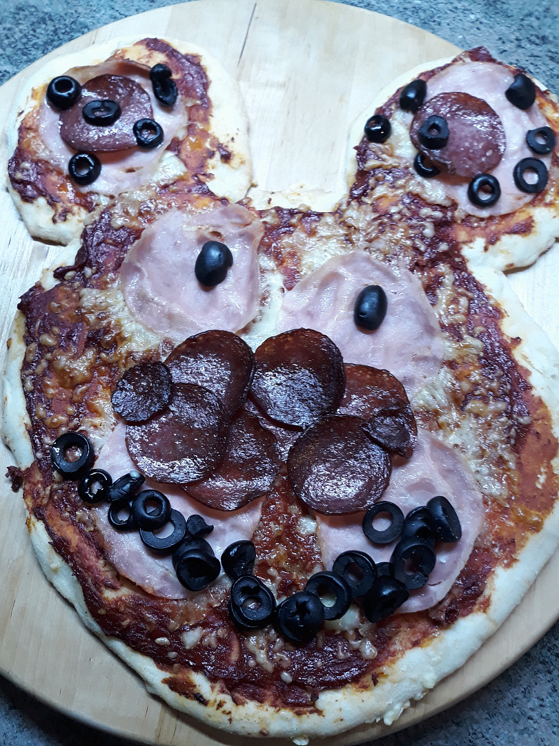 Úprava těsta: Pizza bude ve tvaru medvědí hlavy. Začneme tím, že hlavu a uši pomažeme protlakem. Na pomazané těsto přisypeme sýr, salám a šunku. Přidáme olivy. Nyní zapneme troubu na 200 °C, do té doby pizza ještě trochu nakyne.
