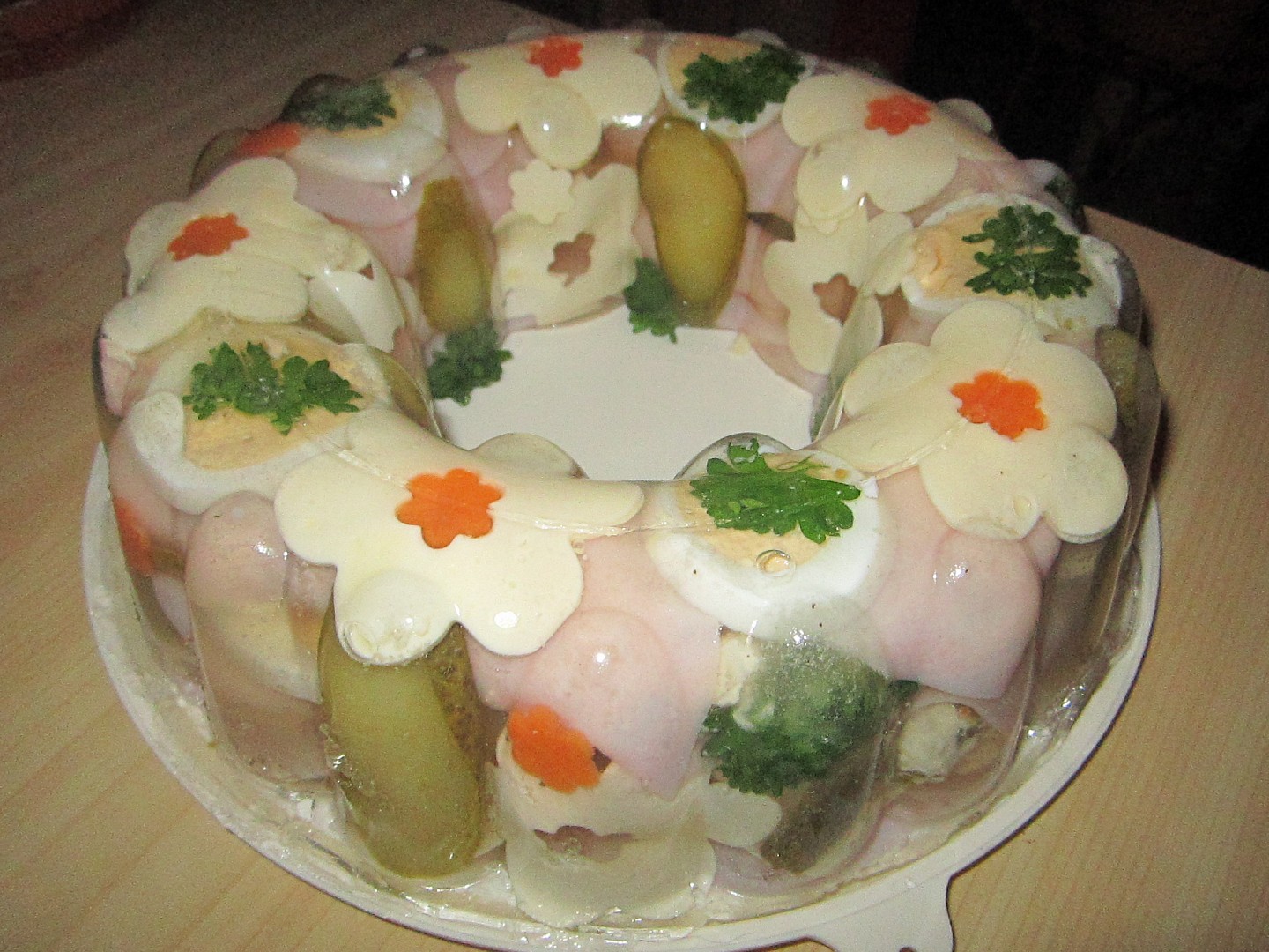 2. Všechny suroviny na želatinku svaříme a necháme chviličku zchladnout jen aby to nebylo úplně vřelé. Pak přimícháme 2 pytlíky želatiny na vaječnou tlačenku a pořádně rozmícháme..