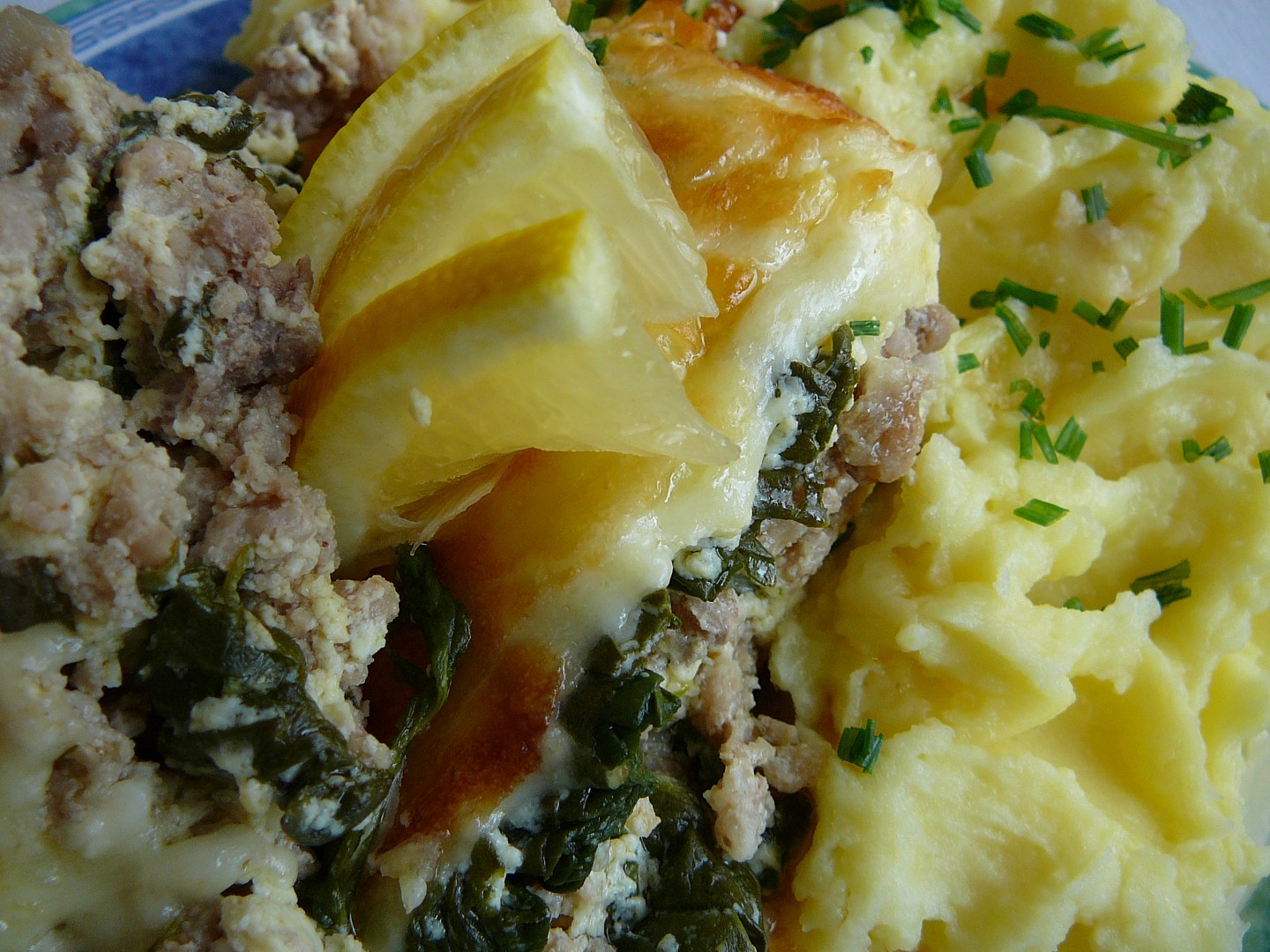 Do tukem vytřené zapékací mísy střídavě vrstvěte masovou směs, špenát, smetanu, nakonec posypte jemně nastrouhaným sýrem a v předehřáté troubě zapečte dorůžova.