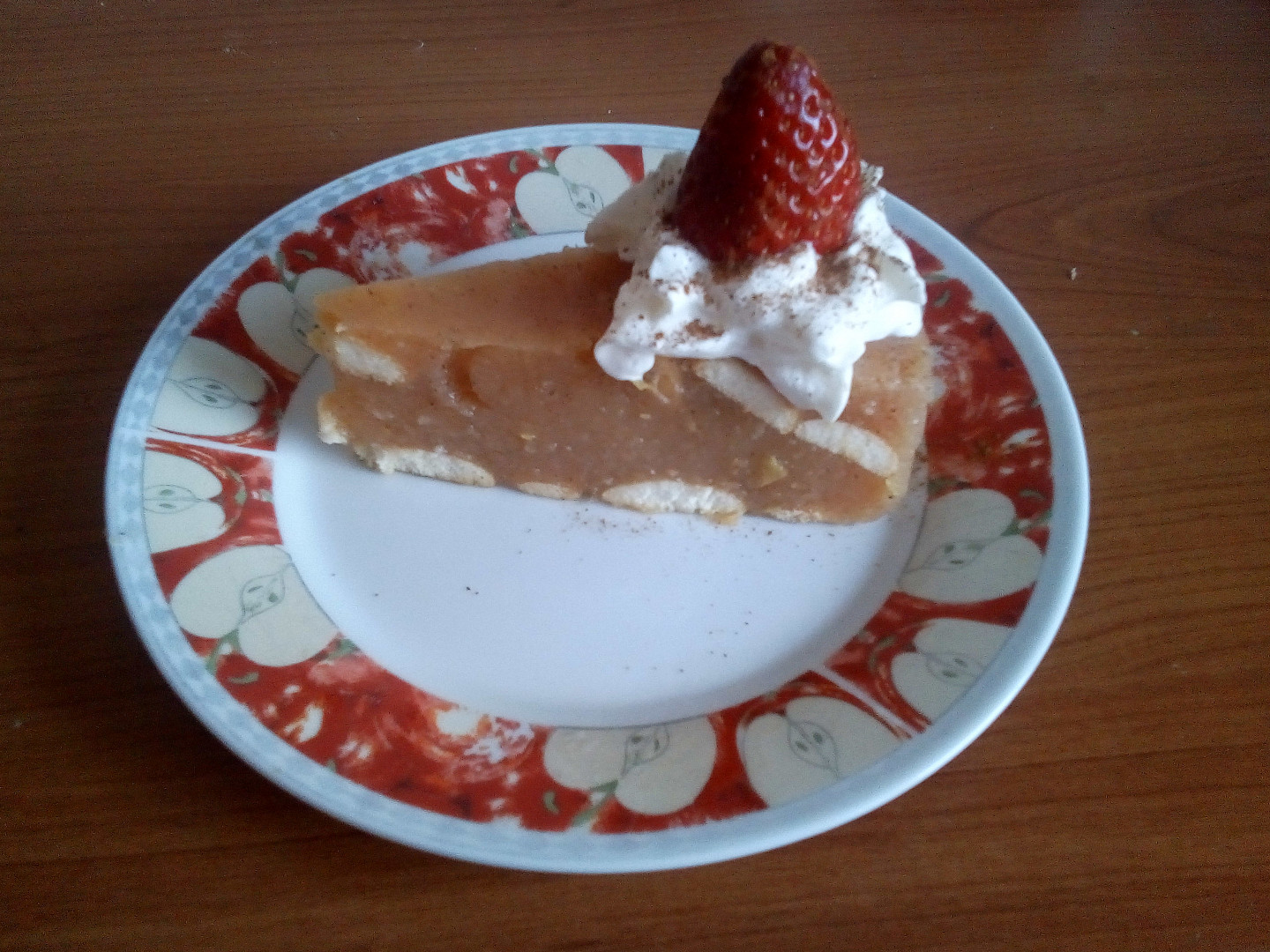 Dno dortové formy poklademe piškoty. Na vrstvu piškotů nalijeme část jablečné hmoty a zase vrstvíme piškoty. Takto pokračujeme dle chuti. Poslední vrstvu zakončíme jablečnou hmotou.