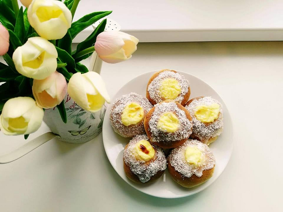 Naplněné bochánky dejte do předem vyhřáté trouby na 225°C a pečte asi 20 minut. Po upečení nechte bochánky vychladnout na mřížce a mezitím připravte cukrovou polevu z moučkového cukru a trochy vody. Podle potřeby můžete vodu přidat. Konzistence by ale měla být hustší, aby z houstiček nestékala.