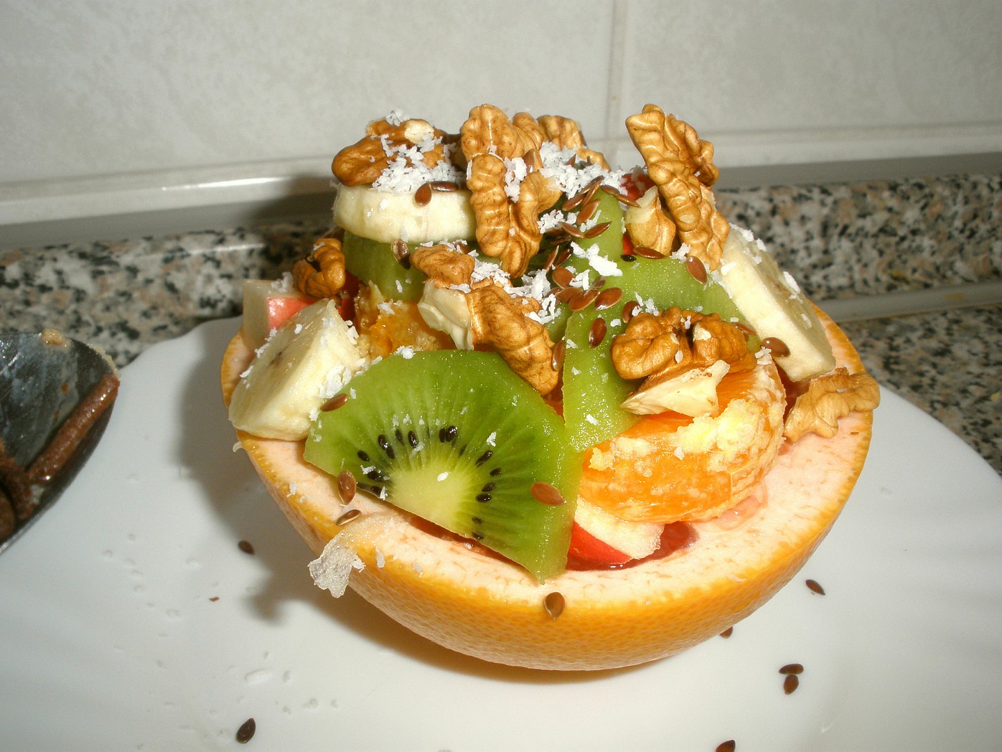 Grep vydlabeme, potřeme medem a naplníme ovocem, poté posypeme semínky.