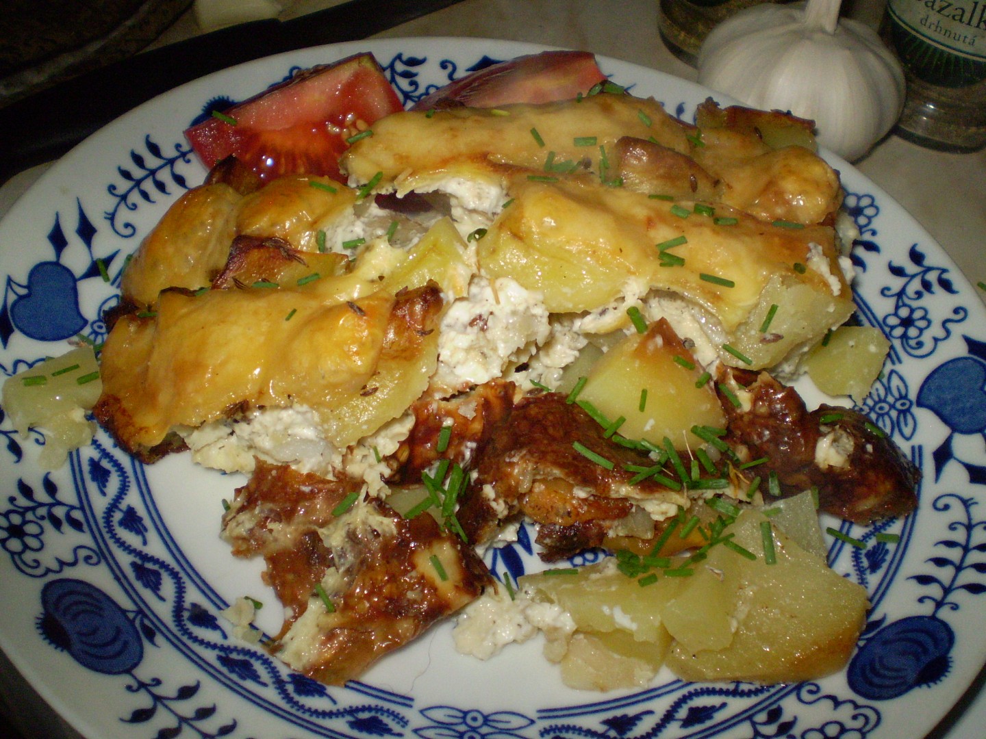 Pak si do smetany rozmícháme vajíčka, zalijeme pekáček a dáme péct do vyhřáté trouby, ke konci pečení dáme na brambory nakrájený tvrdý sýr, nebo plátky a chvíli ještě dopečeme, než se roztaví.