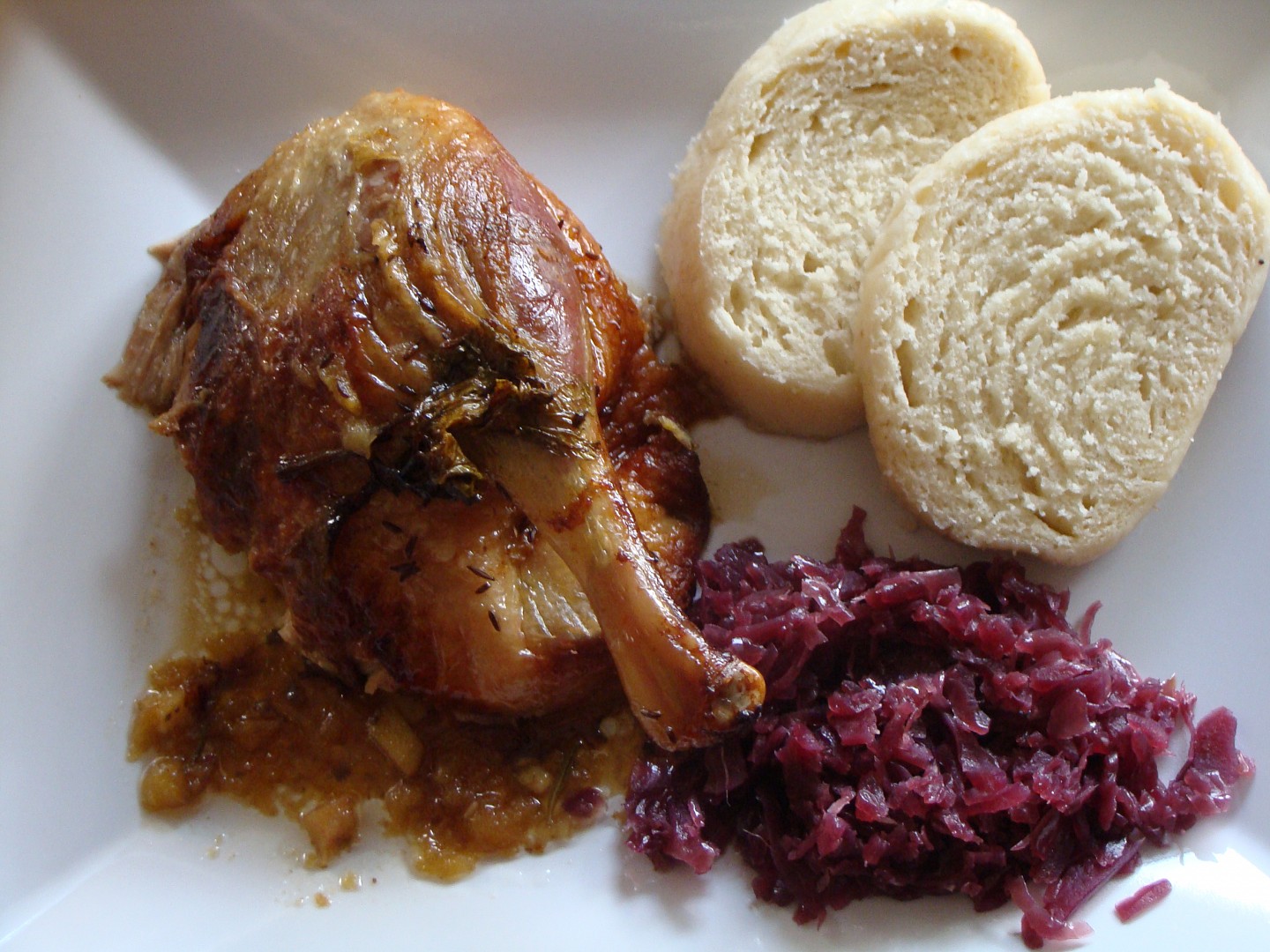 Když je kachna měkká vyndáme jí z pekáče, slijeme větší množství tuku. Do zbytku nalijeme vývar, brandy nebo calvados a svaříme na šťávu. Přidáme směs jablek, zázvoru z břišní dutiny, rozmačkáme a necháme provařit. Podáváme s kynutým knedlíkem a červeným zelím.